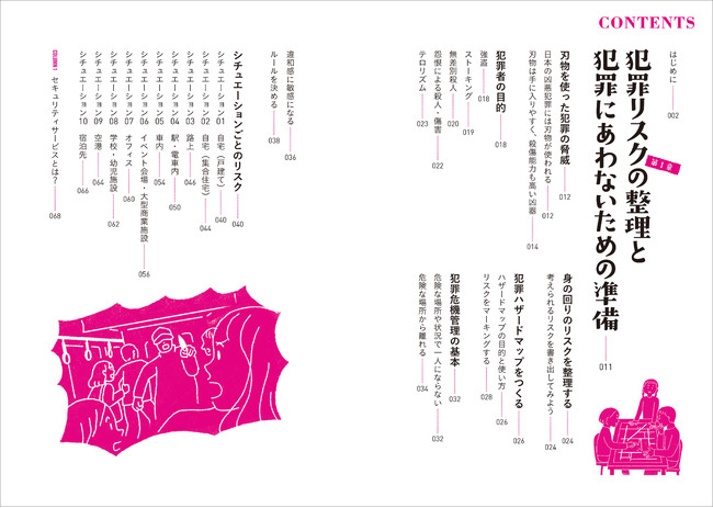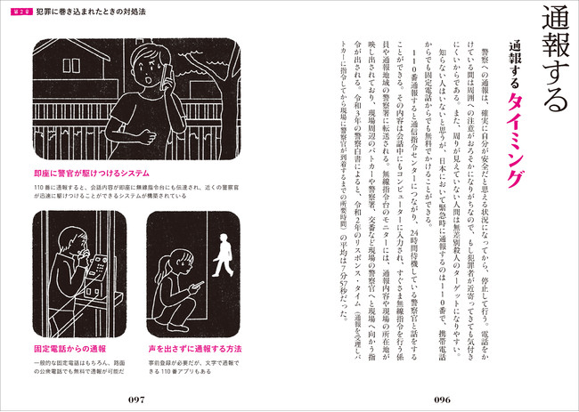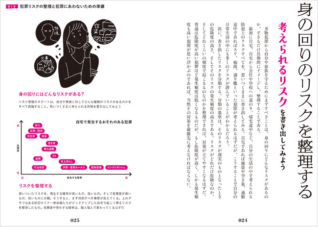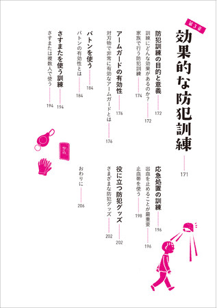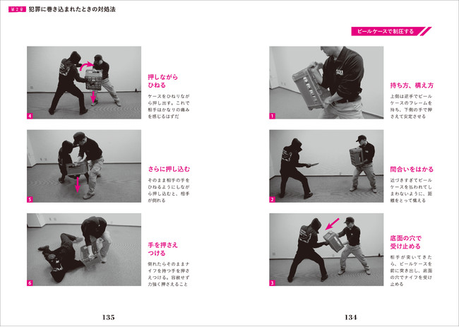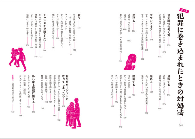 刃物は日本で起こる犯罪の中でもっとも身近な凶器のため、本書は凶悪犯罪の象徴として「刃物犯罪対処法」と謳っています。そのため、刃物を用いた犯罪シーンの想定にもっともページを割いています。
