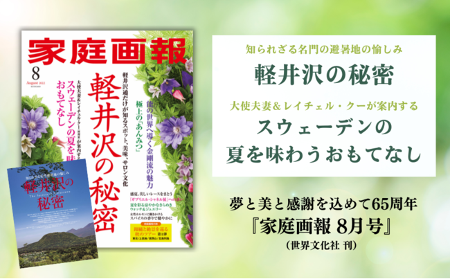 株式会社世界文化社は、『家庭画報 8月号』を7月1日(金)に発売しました。今号では「軽井沢の秘密」と題し、知られざる名門避暑地の愉しみをご紹介。また「スウェーデンの夏を味わうおもてなし」では大使夫妻と人気料理研究家 レイチェル・クーさんによる料理と夏のしつらえをご紹介します。