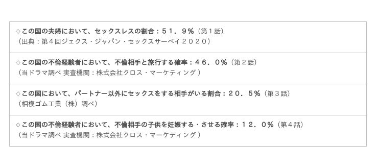 セックスレス・W不倫から始まる怒涛の愛憎ミステリー「わたしの夫はーあの娘の恋人ー」。TVer再生回数累計360万回を突破(2月8日時点での第1話~第4話TVer再生回数・ビデオリサーチ調べ)するなど、その衝撃的な展開に世間の注目が止まらない。そんな当ドラマの4回目の放送を終えたところで、スタッフが総力取材したセックスや不倫に関するデータ、そして第5話以降急展開を迎える物語の見どころを一挙ご紹介!
