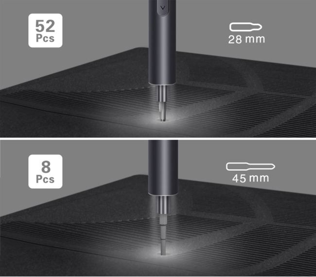 「GeeBolts」には、52種類の短いビット(28mm)と8種類の長いビット(45mm)が付属しています。
