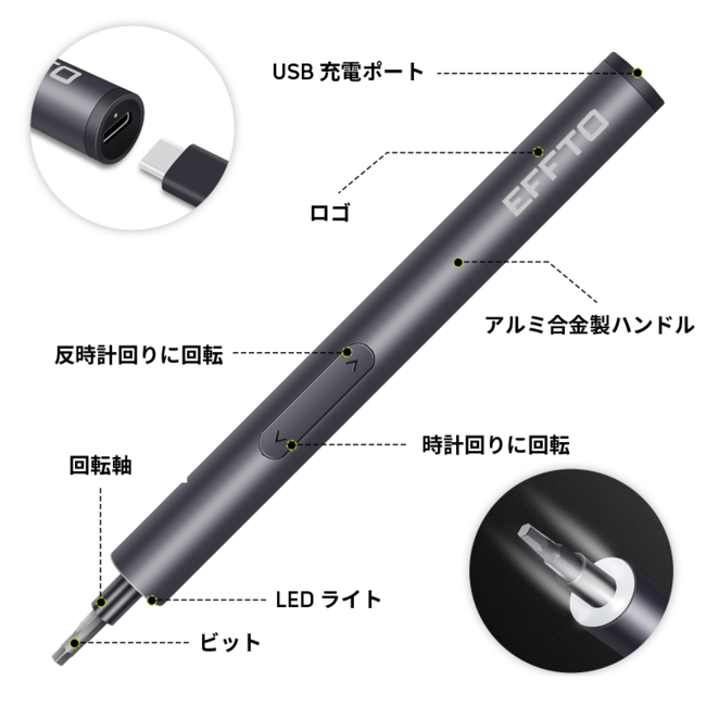 先端に内蔵されているLEDライトで見えにくい手元を照らすことができ、とても便利です。暗い場所や細かな機器でもスムーズに作業することができます。