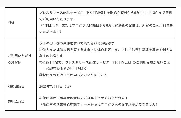 紀伊民報が紹介する事業者に対し、各事業者がそれぞれ開始を希望する日から6カ月間、計3件まで無料で「PR TIMES」でプレスリリース配信いただける「紀伊民報プログラム」を提供します。