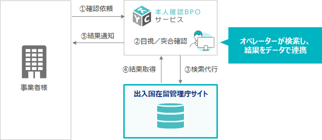 「在留カード失効確認」オプションは、在留カード※3が有効かを出入国在留管理庁のサイトで確認する業務を代行するオプションサービスです。「本人確認BPOサービス」のスタッフが、出入国在留管理庁のサイトで該当の在留カード番号が有効かどうかを確認し、結果データを事業者に返します。本オプションを利用することで、自社で業務フローを構築する必要がなく、在留カードの不正利用を防止できるようになります。