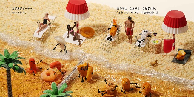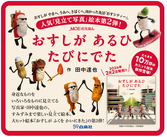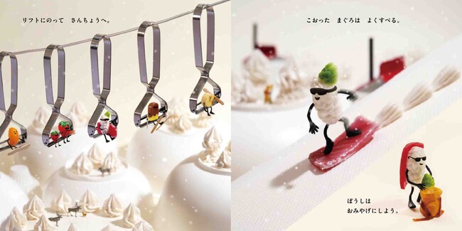 最新作『おすしが あるひ たびにでた』では、マグロのおすしが山へ、海へ、砂漠へ、旅に出ます。めざすは「おすシティ」! 第一作で大人気だったおすしくんが主人公となり、大冒険をくりひろげます。旅で立ち寄ったパン粉の砂浜には、揚がった食べ物たちが! 生クリームの雪山では、ピーラーのリフトに乗ります!