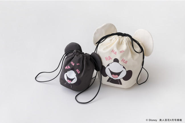 立体的なMICKEYの耳を付けたドロストポーチとバッグが登場。自立するしっかりとしたマチの巾着型で小さめながらも収納力に優れた一点。男女問わずご使用いただけるオフホワイトとブラックの2色展開です。