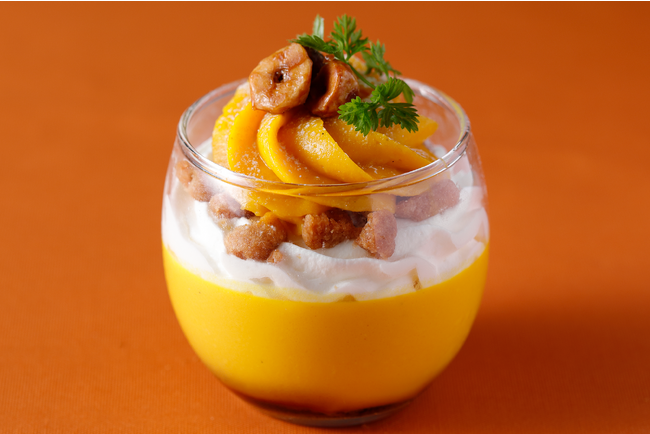 なめらかな食感のパンプキンプリンに生クリーム、クッキー、かぼちゃクリームをデコレーションしたグラスデザート。