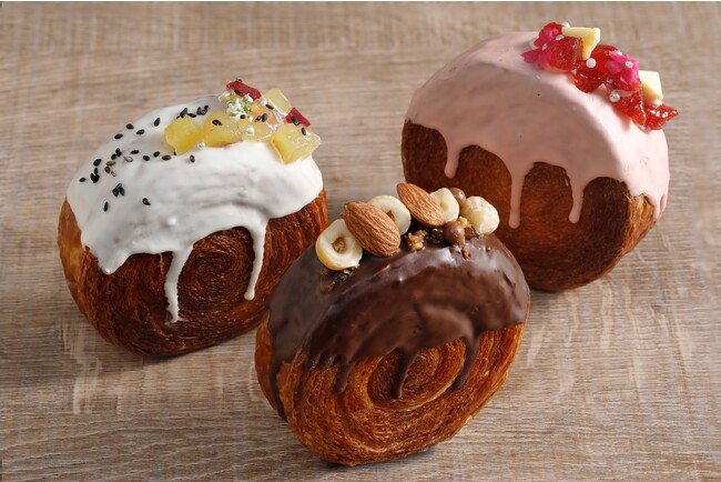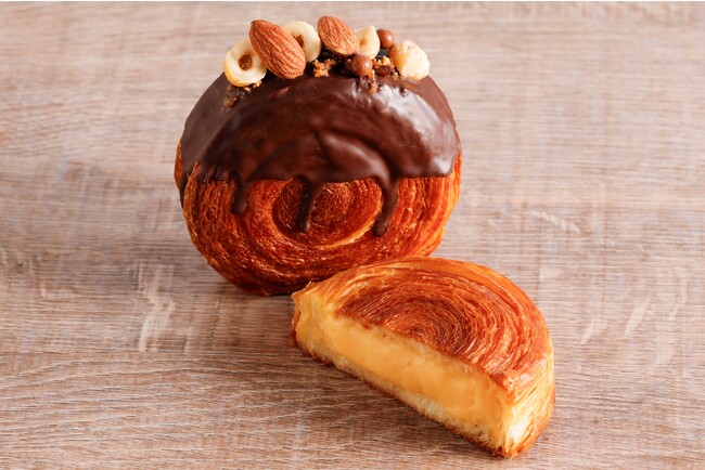 かわいい見た目がSNSでも話題の「シュプリームクロワッサン」は、うずまき状に焼きあげた丸いクロワッサンの中にクリームをたっぷり詰め、チョコレートやナッツなどでデコレーションしたスイーツパンです。チョコレートをコーティングした定番のカスタードなど3種類のフレーバーを販売します。