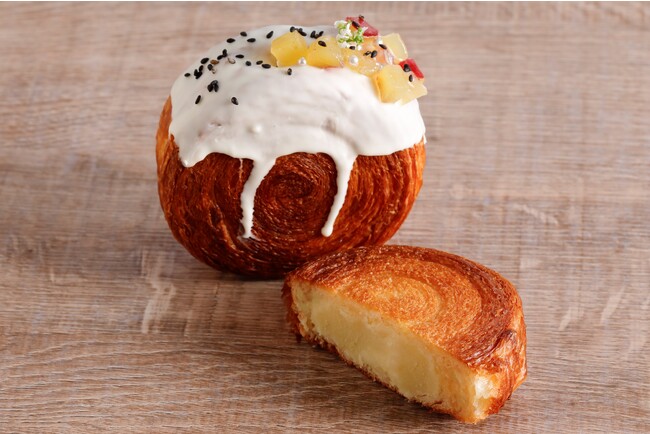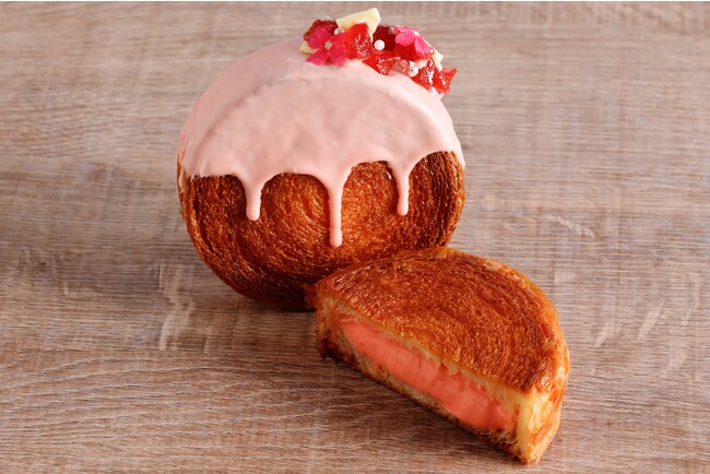 クロワッサン生地の中にいちごジャムなどを合わせたマスカルポーネクリームを入れ、いちご風味のチョコとドライいちごをトッピングしました。甘酸っぱいいちごとクリーミーでコクのあるマスカルポーネ を合わせた、さわやかな酸味を楽しめる一品です。