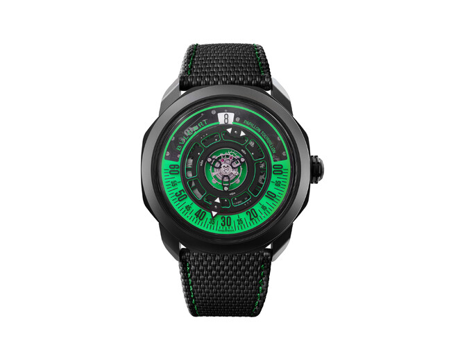 2本の針が交互に時を指し、1本目の針が60分に到達すると夜光性の白いダブルチップが時を知らせます。その間、反対の2本目の針は位置で静止し計時はしません。60分が経過すると舞台が転換するかのような切り替わりが行われ、時刻を指していた針が移動しもう一方の針が垂直の位置に戻ります。鮮やかで目を惹くグリーンカラーを纏った独創的な複雑機構は、コンテンポラリーで都会的なデザインのチタン製ケースに収められ展開されます。