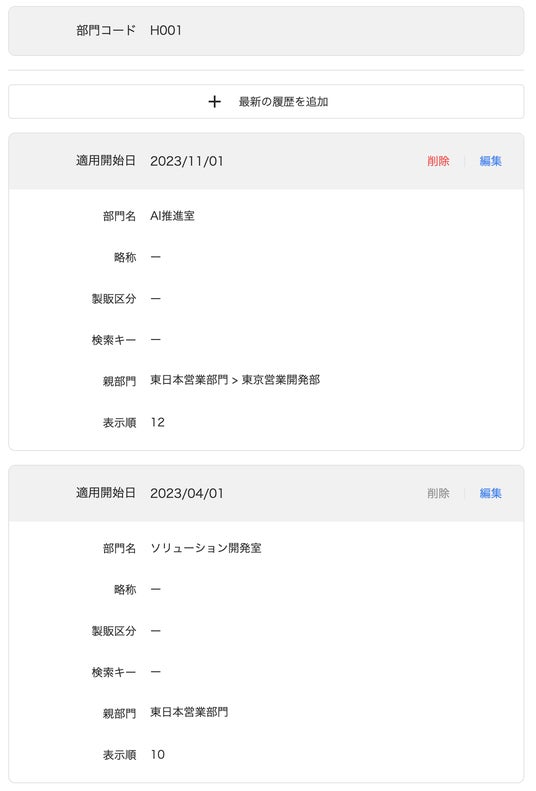 部門の新設から名称や親部門の変更、廃止まで、部門の変遷を履歴管理が可能になります。適切な入力制御がかかると同時に、帳票にはその時点での部門名・組織を表示することができます。