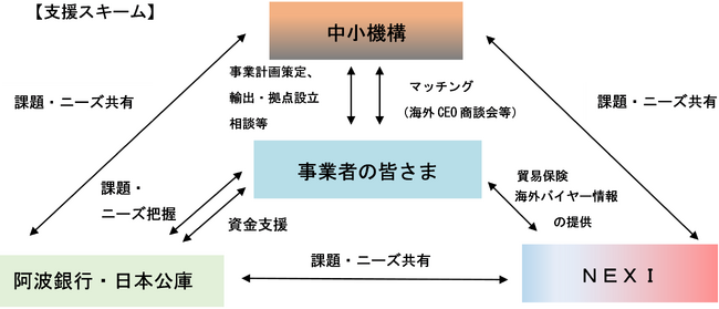 「海外ビジネス支援パッケージ」(以下「本スキーム」)は、海外への販路開拓・拡大等を図るうえでの様々な課題に対する解決支援を行い、円滑な海外展開の実現につなげるため、中小機構、日本公庫及びNEXIが令和4年12月に構築したもので、この度、本スキームに阿波銀行が参加することになりました。