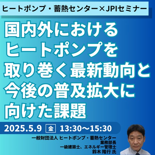 JPI(日本計画研究所)は、一般財団法人 ヒートポンプ・蓄熱センター 業務部長 一級建築士、エネルギー管理士 鈴木 隆行 氏を招聘し、国内外におけるヒートポンプを取り巻く最新動向と今後の普及拡大に向けた課題について詳説いただくセミナーを開催します。