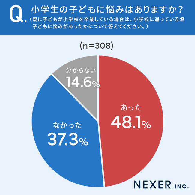 48.1%とほぼ半数の方が、小学生の子どもに悩みがある(あった)と回答しています。