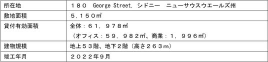 このたび取得した運用資産「180 George Street」(2022年竣工、地上53階、地下2階建て)は、シドニーで最も高い(国際NPO『CTBUH(高層ビル・都市居住協議会)』調べ)地上263mのプレミアムグレードオフィスビルです。IT関連などグローバル企業が多数入居し、低層階には商業施設や広場も備えています。