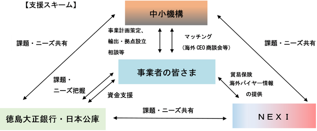 「海外ビジネス支援パッケージ」(以下「本スキーム」)は、海外への販路開拓・拡大等を図るうえでの様々な課題に対する解決支援を行い、円滑な海外展開の実現につなげるため、中小機構、日本公庫及びNEXIが令和4年12月に構築したもので、この度、本スキームに徳島大正銀行が参加することになりました。