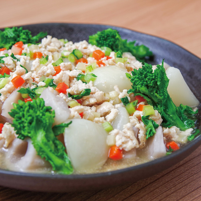 冬の食材、胃もたれの改善や感染症の予防にも良いといわれる蕪を、切り落とした葉とむき皮を一緒に煮込み、鶏ひき肉と生姜をあんかけにした冬のあったかメニューです。万座の温泉とこのメニューで身も心も温まっていただきたいです。