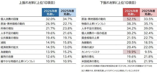 2026年度の業績見通しを上振れさせる材料を尋ねたところ、「個人消費の回復」が32.0%と4年連続でトップになった(複数回答、以下同)。以下、「原油・素材価格の動向」(26.9%)、「所得の増加」(21.7%)が2割超で続いた。前年度と同様に、消費を喚起する材料が目立ち、2026年度も業績のカギを握ることになりそうだ。さらに、「中東情勢により大きく変化する。戦争の終結が早ければ、景気の回復も早くなる」(機械製造、埼玉県)など、中東情勢が改善されることで原油・素材価格をはじめとした各種コストの低減につながり、業績の上振れ材料となりうるという声が多く寄せられた。