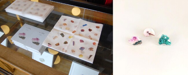 原画展示に合わせて、鉱物標本も展示・販売。イラストと実物の石を同時にご覧いただくことができます。また、鉱物イラストのハンカチやバッチなど、グッズもご用意。さまざまな鉱物の魅力をご堪能いただけます。