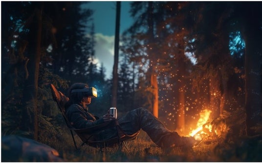 ・Apple Vision Proを装着し、アプリを起動すると、森の中の風景やたき火などを本物のように再現した空間が展開されます。高精度な映像と高音質な演出音によりまるでキャンプに来たかのような没入体験ができます。