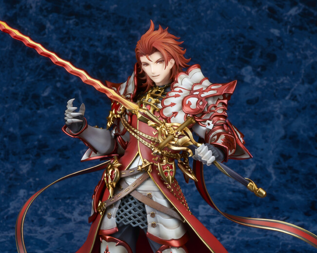 『グランブルーファンタジー』より、炎帝“パーシヴァル”が登場。余裕のある自信に満ちた表情が彼らしく、後ろに流した髪型もしっかり再現。がっしりとした鎧を身に着けながらも、涼やかな視線や軽々と剣を掲げる仕草は優美さを感じさせます。甲冑は複雑なディテールがシャープに造形され、サーコートのたなびく動きや、装飾など情報量の多い仕上がりです。炎を連想させる独特な形状の剣も、メタリックカラーや、クリアパーツを用い質感豊かに彩色しました。