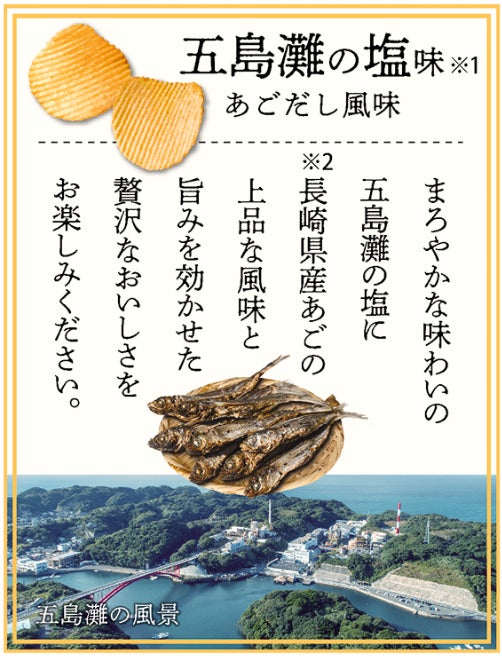 ●粒度の異なる2種類の五島灘の塩と長崎県産あごを使用。まろやかな味わいが特徴の五島灘の塩に長崎県産あごを加えることで、あごの上品な風味とほどよい塩味が味わえる贅沢なポテトチップスです。