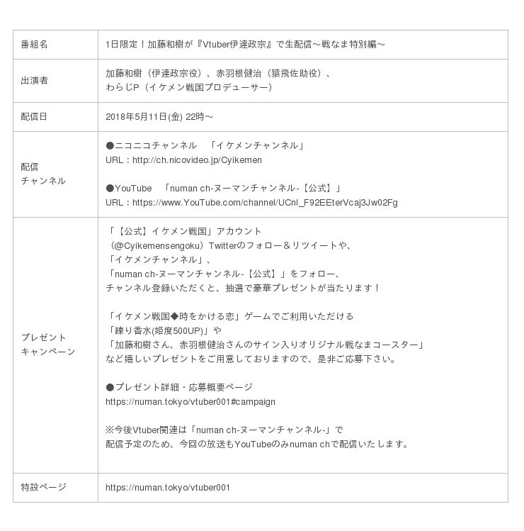 株式会社サイバード(本社:東京都渋谷区、代表取締役社長:内海 州史)が手掛ける女性向けスマホ恋愛ゲーム「イケメンシリーズ」の人気タイトル『イケメン戦国◆時をかける恋』の配信番組(5月11日22時放送予定)で、人気俳優 加藤和樹さんがバーチャルYouTuber伊達政宗(以下、Vtuber伊達政宗)として初登場します。