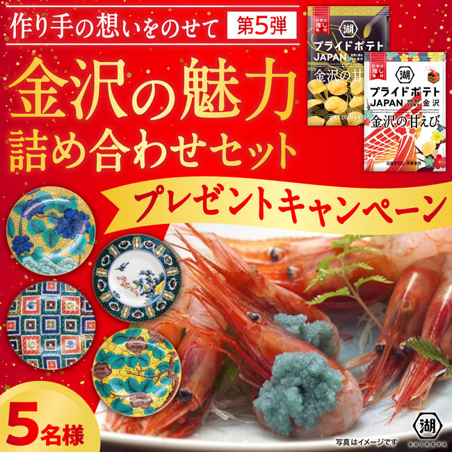 「湖池屋プライドポテト JAPAN 金沢の甘えび」の発売をきっかけに、長い歴史の中で磨き高められてきた文化芸術が人々の暮らしの中に息づく“金沢”の魅力を全国のみなさまに知っていただきたく、金沢の魅力をまとめた「作り手の物語記事」をweb上にアップしました。当キャンペーンは、こちらの記事をお読みいただいた上でシェアしていただくと、ご応募できる形式となっています。プレゼントには、金沢の育む海の幸である「冷凍甘えび:1kg」に加えて、金沢の誇る伝統工芸品である「九谷焼 豆皿(4枚セット)」といった豪華な商品の詰め合わせをご用意しています。記事を通して“作り手の想い”をご覧になられた上で、ぜひ“金沢の魅力 詰め合わせ”が当たるキャンペーンにご応募ください。