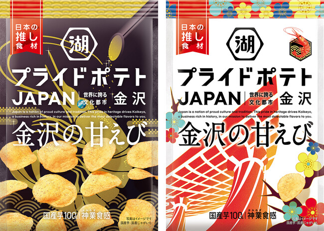 今年で4年目を迎える「湖池屋プライドポテト JAPAN 金沢の甘えび」は、金沢が誇る海の幸である“金沢の甘えび”をそのまま乾燥させて粉末化したものをチップスにかけた濃厚な旨みが引き立つ、コク深い味わいです。金沢美術工芸大学の学生たちが金沢をイメージして作成したパッケージデザインを採用しており、毎年多くのお客様からご評価をいただいております。