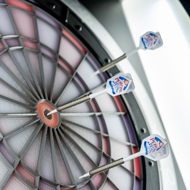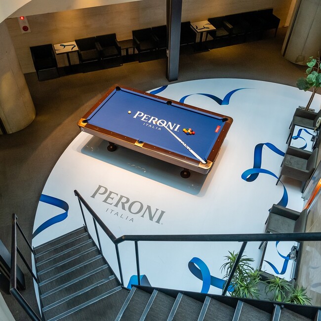 10月より「バネバグース宮益坂店」はプレミアムイタリアンビール『ペロー二 ナストロアズーロ』の旗艦店として期間限定でコラボレーションいたします。『ナストロアズーロ』とはイタリア語で『青いリボン』という意味ですが、期間中店内は爽やかな風にのって青いリボンが舞うイメージに包まれ、『ペローニ ナストロアズーロ』一色に。吹き抜けから見下ろすペローニ特設ビリヤードや筐体がペローニで統一されたダーツ機など、圧巻のロケーションが体験いただけます。