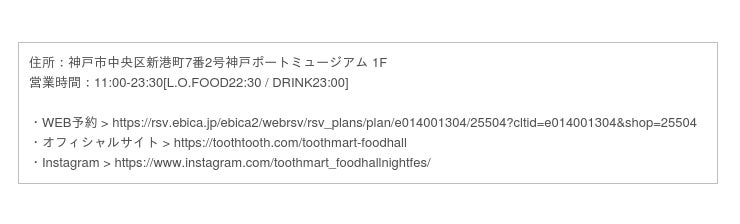 神戸の最新スポット!ハーバーを一望できる「神戸ポートミュージアム」1Fにある神戸最大級のフードホール「TOOTH TOOTH MART FOOD HALL&NIGHT FES」で、思い出に残る、春の歓迎会・送別会を!