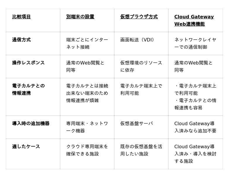 そのため、クラウド型の業務支援サービスを利用するには、電子カルテ端末とは別の端末を用意する方法や、仮想ブラウザを経由する方法など、各施設の環境に合わせた接続手段が取られてきました。
