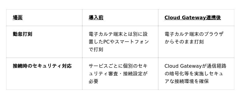 閉域網の電子カルテ端末からCloud Gatewayのセキュアな通信経路を通じてDr.JOYにアクセスできます。電子カルテで患者情報を確認しながら、同じ端末上でDr.JOYの勤怠管理(出退勤打刻・申請・承認)を利用でき、端末を切り替えることなくシームレスな業務が実現します。