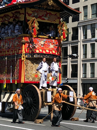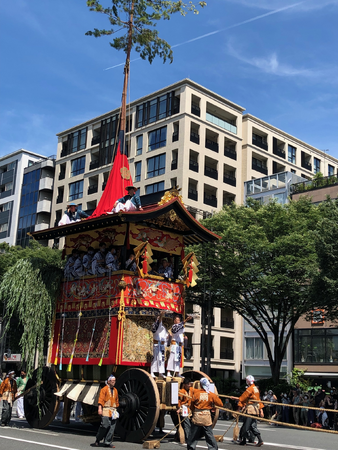 千年以上の歴史があり、1か月にわたり祭事が行われる京都の夏の風物詩です。街中にコンコンチキチン、コンチキチンと祇園囃子の音が鳴ります。17日(前祭)と24日(後祭)の山鉾巡行は祇園祭の人気のイベントです。各山鉾は刺繍や舶来の織物など懸装品と呼ばれる装飾品の美しさから「動く美術品」ともいわれています。