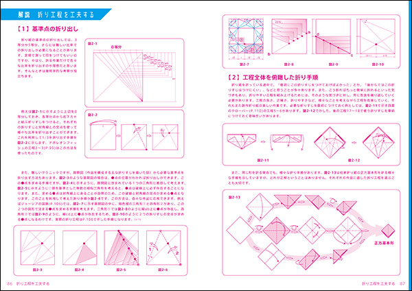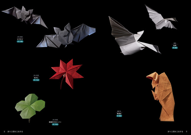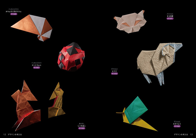 細く折ったり正確な折りすじをつける際の注意点や立体化の方法(「きれいに折る」)から、誰でも折れるようにわかりやすい工程に落とし込んだり、糊などを使わずに紙を開かないようにする工夫(「折り工程を工夫する」)、蛇腹折りやインサイドアウトなど特有の折り方を使って新たな作品を生み出すためのヒント(「デザインを考える」)を、作品を通じて紹介します。