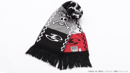 ONE PIECEロゴはもちろん、サニー号のシルエットやスカルマークを編み地で表現した風合いのある1本。