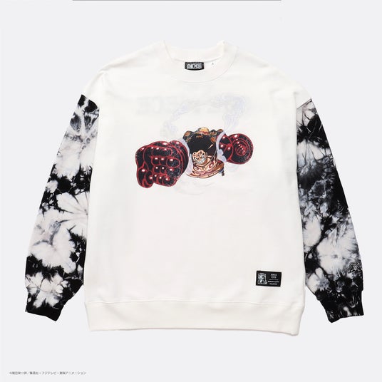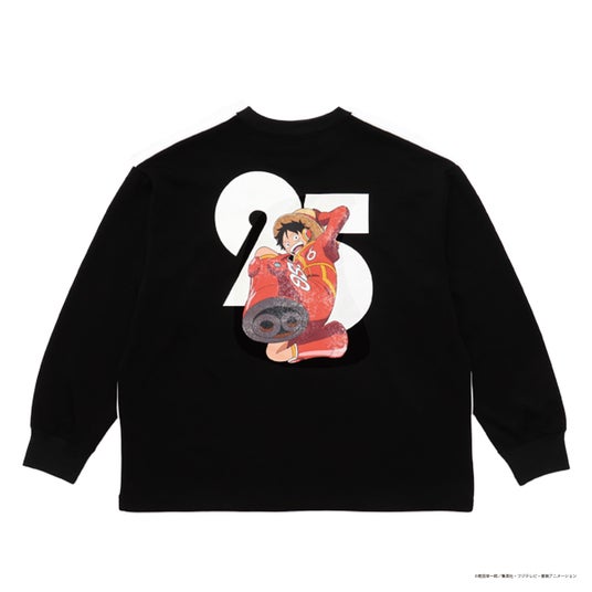 ルフィの戦いのシーンを描いた3柄は、袖部分がタイダイ染めになったインパクトのあるデザイン。袖にはスカル刺繍入り。バックには25周年を意味する「25」をアレンジしたマークを上部分に発泡プリント配した立体感のあるデザイン。大きく刺繍されたワンピースロゴが目を惹きます。ほどよいオーバーシルエットに仕上げており、フロントには25周年のスペシャルネームが付いています。