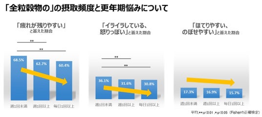 「全粒穀物(玄米、発芽玄米、雑穀、全粒粉パンなど)」の摂取頻度が高い人ほど、「疲れが残りやすい」「イライラしている、怒りっぽい」と回答する割合が有意に低かった。また、「ほてりやすい、のぼせやすい」と回答する割合も低くなる傾向があった。