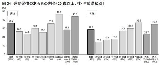 一方で、厚生労働省の令和5年国民健康・栄養調査によると、「1回30分以上の運動を週2回以上実施し、1年以上継続している者」は、40代女性で「17.9%」、50代女性は「27.4%」と低い。
