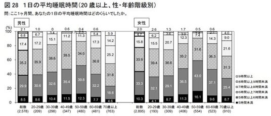 厚生労働省の令和5年国民健康・栄養調査によると、40、50代女性の約半数が6時間未満という調査結果が出ている。仕事や子育て、介護などで忙しい毎日を送る中、睡眠時間を確保するのは難しい世代だが、何とか工夫して少しでも睡眠時間を確保できることが望ましいと考えられる。