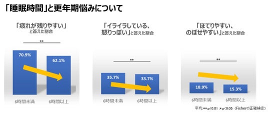 睡眠時間が「6時間以上」の人は、「6時間未満」の人と比較して、「疲れが残りやすい」「イライラしている、怒りっぽい」「ほてりやすい、のぼせやすい」と回答する割合が有意に低かった。