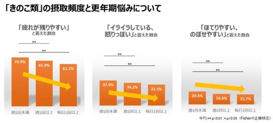 「きのこ類」の摂取頻度が高い人ほど、「疲れが残りやすい」「イライラしている、怒りっぽい」「ほてりやすい、のぼせやすい」と回答する割合が有意に低かった。