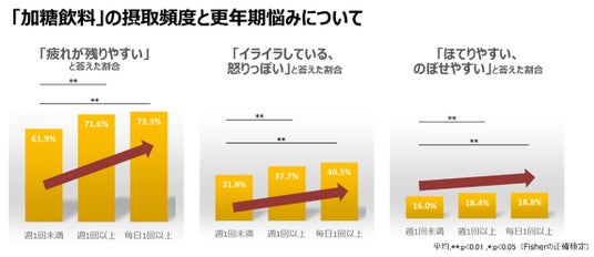 「加糖飲料(ジュースや缶コーヒーなどの砂糖を含む飲料)」の摂取頻度が高い人ほど、「疲れが残りやすい」「イライラしている、怒りっぽい」「ほてりやすい、のぼせやすい」と回答する割合が有意に高かった。
