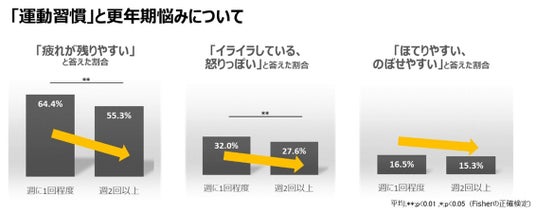 「週2回以上」の運動習慣(※1回30分以上の運動)のある人は、「週1回程度」の人と比較して、「疲れが残りやすい」「イライラしている、怒りっぽい」と回答する割合が有意に低かった。また、「ほてりやすい、のぼせやすい」と回答する割合も低くなる傾向があった。