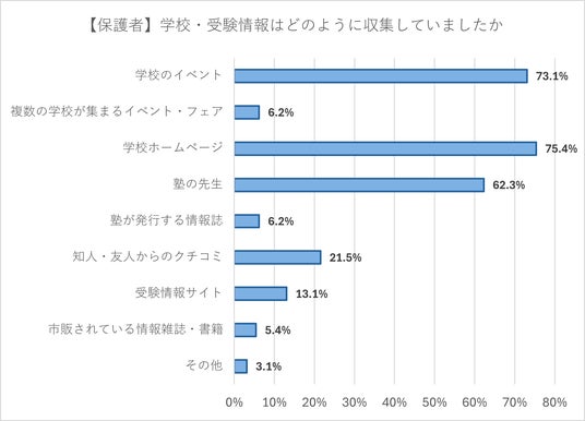 保護者に、学校や受験情報をどのように収集していたか聞いたところ、「学校ホームページ」と「学校のイベント」が7割超にのぼった。