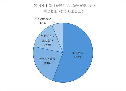 受検生に、受検を通じて勉強が楽しいと感じるようになったかを聞いたところ、「そう思う」が55.7%、「ややそう思う」が22.6%だった。約8割の受検生が、受検を通じて勉強を楽しいと感じるようになったことが明らかとなった。