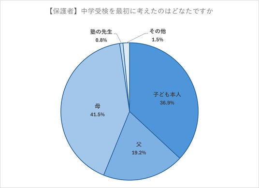 受検生の保護者に、最初に中学受検をしようと考えた人を聞いたところ、41.5%の保護者が「母」と回答し、次いで、「子ども本人」が36.9%、「父」が19.2%となった。公立中高一貫校を受検した家庭の多くは、母もしくは子ども本人が最初に中学受検をしようと考えたことが明らかとなった。