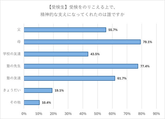 受検生に、受検をのりこえる上で精神的な支えとなった人を聞いたところ、「母」が最も多く79.1%、次いで「塾の先生」が77.4%と、受検生にとって、周囲の大人が支えとなっていることが分かった。また、「塾の友達」も61.7%となり、大人だけでなく友人も受検勉強の支えになっているようだ。