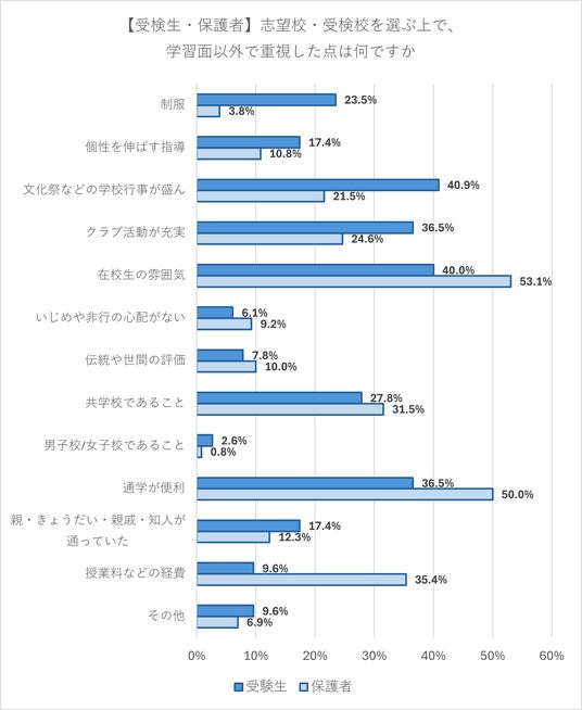 志望校・受検校を選ぶ上で、学習面以外について重視したポイントを、受検生・保護者にそれぞれ聞いた。