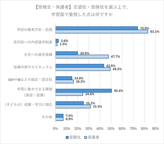 受検生・保護者ともに最も重視したポイントは「教育方針・校風」で、受検生の73.9%、保護者の83.1%にのぼった。また、「指導内容やカリキュラム」も、受検生・保護者とも5割弱と、重視する傾向が分かった。