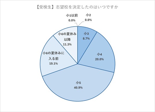 志望校を決めた時期を受検生に聞いたところ、「小5」が最も多く40.9%だった。公立中高一貫校受検は、住んでいる地域によって受検できる学校が限られる。そのため、小6になってから志望校を決定した割合が約6割だった私立・国立中学校の受験生と比べて、公立中高一貫校の受検生は、志望校決定の時期が早いと考えられる。